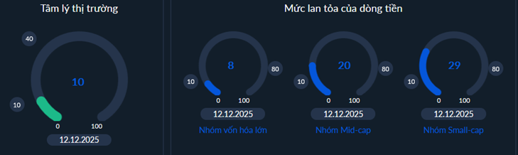 Chỉ báo đà lan tỏa tụt trở lại sâu dưới mức trung bình (50%) phản ánh rõ sự rút lui mạnh của dòng tiền trên diện rộng thị trường. Chiều hướng vận động của dòng tiền sẽ đi theo kích bản tiêu cực nếu dòng tiền có thể sẽ đạt trạng thái "rũ bỏ" mạnh trên diện rộng (<10%) trên hầu hết các nhóm cổ phiếu từ đó dễ dàng hơn trong việc tiết cung mạnh và tạo tiền đề cho khả năng tạo đáy sớm và hồi phục cho thị trường.
