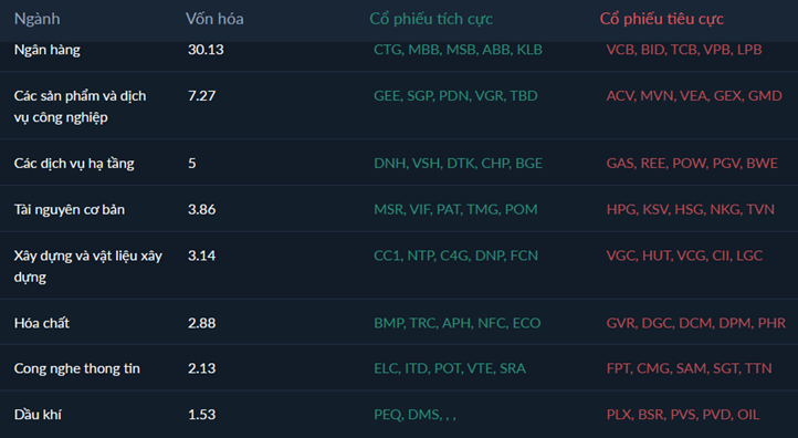 Nhóm cổ phiếu có tính dẫn dắt chỉ số đang suy yếu rõ rệt trong đó nhóm BĐS cũng không còn là trọng số trong gánh thị trường khi đang dịch chuyển sang về vùng Suy yếu. Nhóm Ngân hàng thậm chí phản ứng tiêu cực hơn khi lọt vào vùng Giảm mạnh càng gây áp lực hơn cho chỉ số thị trường. Khi thị trường không còn nhóm trụ thì hầu hết các nhịp hồi phục sẽ khá yếu và thiếu bền vững vì vậy các vị thế mua mới nên chú ý quan sát tới đặc điểm này để có điểm giải ngân mới tối ưu nhất.