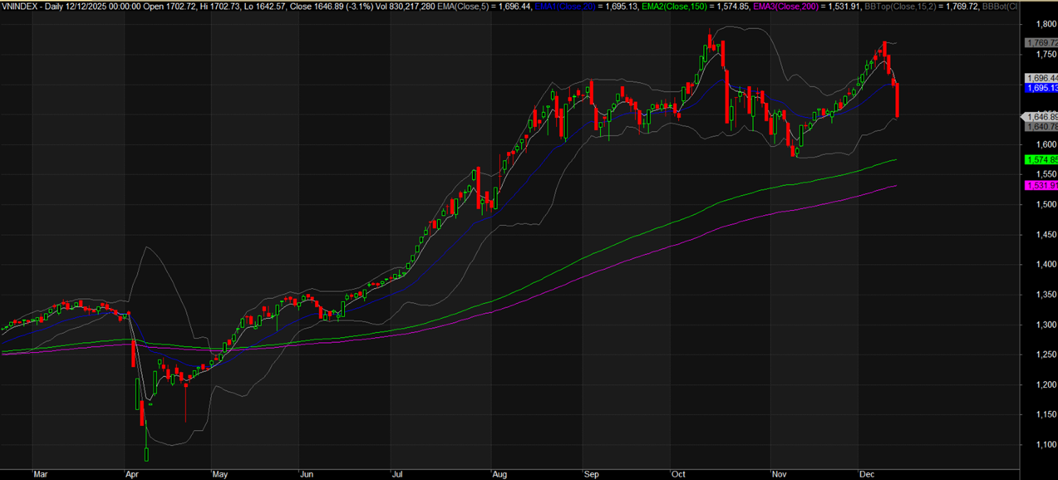 Đà giảm điểm mạnh chủ yếu xuất phát từ áp lực bán đột biến và lan rộng, đặc biệt là trong phiên cuối tuần, với một loạt cổ phiếu thuộc nhiều nhóm ngành giảm sâu. Nguyên nhân chính được cho là sự lao dốc nhanh của nhóm cổ phiếu vốn hóa lớn, đặc biệt là các mã liên quan đến Vingroup (VIC, VHM, VRE) sau khi kiểm định vùng đỉnh ngắn hạn tương ứng đỉnh tháng 10/2025, gây sức ép tâm lý rất lớn lên toàn thị trường. Tâm lý thị trường chung đã không còn mặn mà với các phiên kéo do nhóm trụ vì vậy nhịp bán “trả điểm” cuối tuần cũng không phải là diễn biến bất ngờ. Tuy nhiên sự đồng thuận giảm của nhóm Ngân hàng, cùng Chứng khoán, từng là những đầu tàu dẫn dắt và hiện chờ tín hiệu tạo đáy ngắn hạn đã gây áp lực điều chỉnh mạnh, một số mã có dấu hiệu phá vỡ nền tích lũy trước đó, đã kích hoạt tâm lý bán lan sang các nhóm ngành khác.