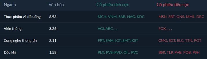 Nhóm vốn hóa lớn cuối cũng cũng không tránh khỏi đà bán chung của thị trường, chỉ số chịu áp lực giảm là khó tránh khỏi. Hiện cả 02 nhóm trụ là Ngân hàng và BĐS đều rơi vào vùng Giảm mạnh và Suy yếu, khả năng phục hồi của chỉ số cũng trở nên khó khăn hơn. Diễn biến này sẽ quyết định lớn tới khả năng tiếp tục giảm hoặc cơ hội sớm tạo đáy của chỉ số thị trường. Một số nhóm ngành đặc biệt là tại Midcap lại cho thấy sự phân kỳ tích cực đáng chú ý so với đà giảm chung (Viễn thông, Công nghệ, Thực phẩm, Dầu khí, Dịch vụ CN, Hóa chất...) có thể đây sẽ là một số trọng điểm sôi động trong tuần mới của dòng tiền.