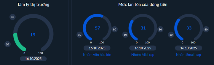 Phiên giao dịch ngày 16/10 diễn ra trong bối cảnh giằng co và thận trọng trong phiên sáng, chủ yếu do trùng với thời điểm đáo hạn hợp đồng tương lai Tháng 10. Tuy nhiên, thị trường đã nhanh chóng lấy lại đà tăng nhờ lực kéo mạnh mẽ từ nhóm cổ phiếu vốn hóa lớn, đặc biệt là sự bứt phá trở lại của các mã thuộc nhóm Vingroup (VIC, VJC) và cổ phiếu MSN tăng kịch trần kèm giao dịch thỏa thuận kỷ lục. Sắc xanh chiếm ưu thế và lan tỏa rộng hơn trong phiên chiều, cho thấy sự cải thiện về độ rộng thị trường, thay vì chỉ tập trung ở một số trụ cột như những phiên trước. Đây là tín hiệu đáng chú ý và cần theo dõi sát nếu có chiều hướng tiếp tục cải thiện, dòng tiền khi mở rộng sẽ đem lại nhiều sự lựa chọn và cơ hội đầu tư phong phú hơn cho các vị thế ngắn hạn.