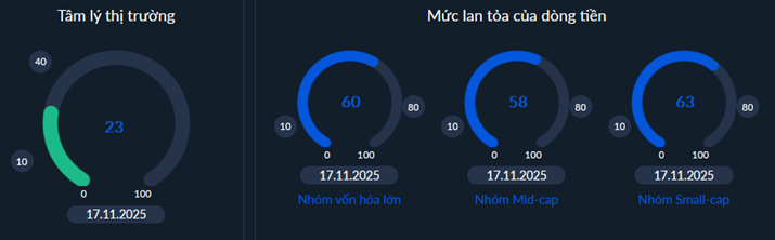 Phiên giao dịch ngày 17/11/2025 kết thúc với mức tăng điểm tích cực của các chỉ số chính, đặc biệt là VN-Index tuy nhiên thanh khoản vẫn duy trì ở mức trung bình thấp so với giai đoạn thị trường sôi động trước đó, phản ánh tâm lý giao dịch vẫn còn tương đối thận trọng. VN-Index đã thể hiện nỗ lực bứt phá khỏi ngưỡng kháng cự gần tại 1650 điểm, với sự hỗ trợ từ dòng tiền tham gia chủ yếu vào nhóm cổ phiếu Vốn hóa lớn (VN30) và một số cổ phiếu Midcap có câu chuyện kinh doanh và lợi nhuận Quý IV tích cực nhưng xu thế giá đã có sự chiết khấu sâu đáng kể.