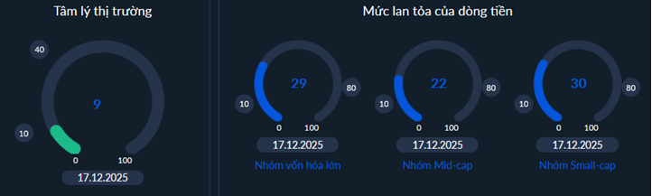 Chỉ báo đà lan tỏa tụt trở lại sâu dưới mức trung bình (50%) phản ánh rõ sự rút lui mạnh của dòng tiền trên diện rộng thị trường. Chiều hướng vận động của dòng tiền sẽ đi theo kích bản tiêu cực nếu dòng tiền hướng tới trạng thái "rũ bỏ" mạnh trên diện rộng (<10%) trên hầu hết các nhóm cổ phiếu nhưng chuyển động này sẽ dễ dàng hơn trong việc tiết cung mạnh và tạo tiền đề tạo đáy sớm và hồi phục thị trường.