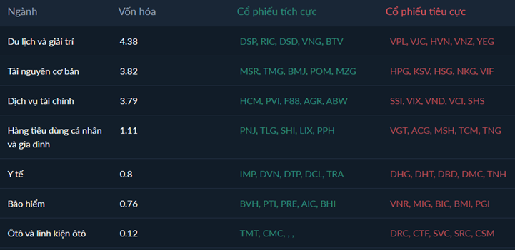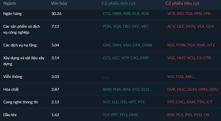 Nhóm cổ phiếu có tính dẫn dắt chỉ số đang suy yếu rõ rệt trong đó nhóm BĐS cũng không còn là trọng số gánh thị trường khi đang dịch chuyển sang về vùng Suy yếu. Nhóm Ngân hàng thậm chí phản ứng tiêu cực hơn khi lọt vào vùng Giảm mạnh càng gây áp lực hơn cho chỉ số thị trường. Khi thị trường không còn nhóm trụ thì hầu hết các nhịp hồi phục sẽ khá yếu và thiếu bền vững vì vậy các vị thế mua mới nên chú ý quan sát tới đặc điểm này để có điểm giải ngân mới tối ưu nhất.