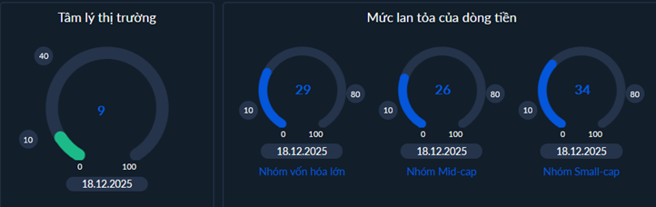 Chỉ báo đà lan tỏa tụt trở lại sâu dưới mức trung bình (50%) phản ánh rõ sự rút lui mạnh của dòng tiền trên diện rộng thị trường. Chiều hướng vận động của dòng tiền sẽ đi theo kích bản tiêu cực nếu dòng tiền hướng tới trạng thái "rũ bỏ" mạnh trên diện rộng (<10%) trên hầu hết các nhóm cổ phiếu nhưng chuyển động này sẽ dễ dàng hơn trong việc tiết cung mạnh và tạo tiền đề tạo đáy sớm và hồi phục thị trường.