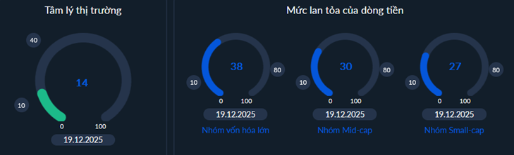 Chỉ báo đà lan tỏa tụt có phục hồi trong những phiên cuối tuần qua tuy nhiên duy trì dưới mức trung bình (50%) phản ánh rõ sự hoạt động yếu kém của dòng tiền trên diện rộng thị trường. Kích bản tiêu cực vẫn để ngỏ nếu dòng tiền hướng tới trạng thái "rũ bỏ" mạnh trên diện rộng (<10%) trên hầu hết các nhóm cổ phiếu nhưng chuyển động này sẽ dễ dàng hơn trong việc tiết cung mạnh và tạo tiền đề tạo đáy sớm và hồi phục thị trường.