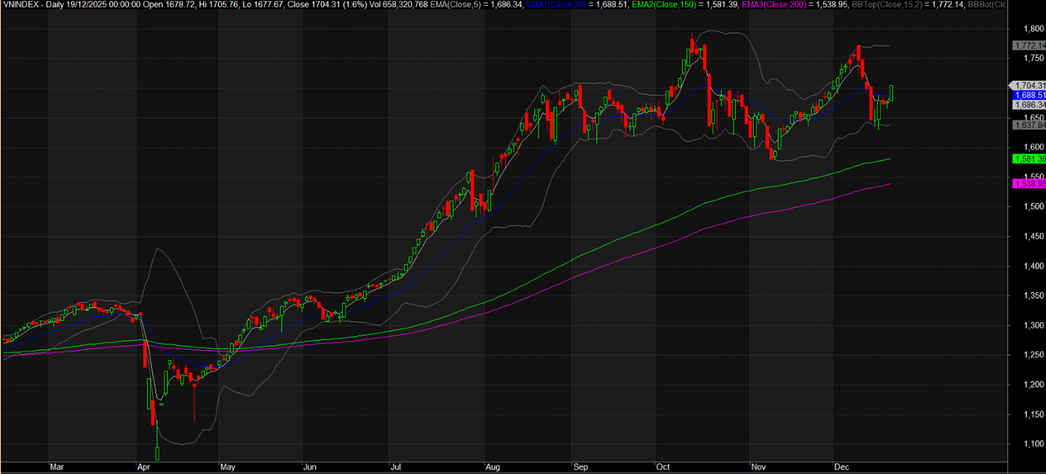 Thị trường chứng khoán tuần qua diễn ra đầy cảm xúc với sự đảo chiều ngoạn mục từ trạng thái bi quan sang hưng phấn nhẹ vào giai đoạn cuối tuần. Sau khi hứng chịu áp lực bán tháo cực mạnh trong tuần trước đó khiến chỉ số rơi sâu về vùng hỗ trợ 1.630 điểm, VN-Index đã ghi nhận một nhịp phục hồi khá ấn tượng với mức tăng tổng cộng hơn 57 điểm, tương đương 3,49%, chính thức đóng cửa tuần tại 1.704,31 điểm. Việc giành lại ngưỡng tâm lý quan trọng 1.700 điểm không chỉ giúp giải tỏa áp lực kỹ thuật sau khi các đường trung bình động ngắn hạn bị xuyên thủng, mà còn nhen nhóm hy vọng về một kịch bản tạo đáy ngắn hạn bền vững trước thềm chốt sổ năm 2025.
