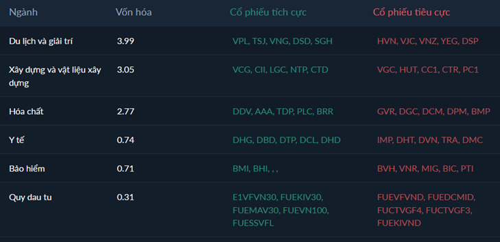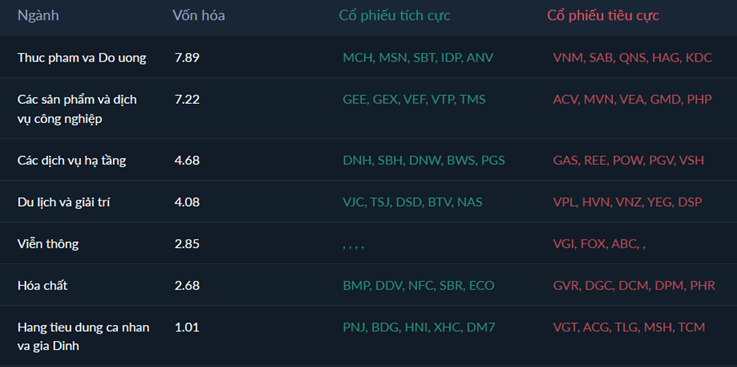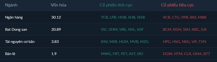 Nhóm vốn hóa lớn đang thể hiện nỗ lực vực dậy thị trường khá rõ rệt trong chuỗi nhiều phiên. Sau phiên hôm nay Ngân hàng và BĐS vẫn xuất hiện ở vùng Tăng mạnh cho thấy đây vẫn là những trụ giúp đem lại lực đỡ cho chỉ số chung của thị trường nếu như nhóm này sớm hồi phục. Hiện chỉ còn Bán lẻ là vẫn còn diễn biến tích cực thuộc nhóm vốn hóa vừa cho thấy sự lựa chọn cho các giao dịch ngắn hạn rất hạn chế.