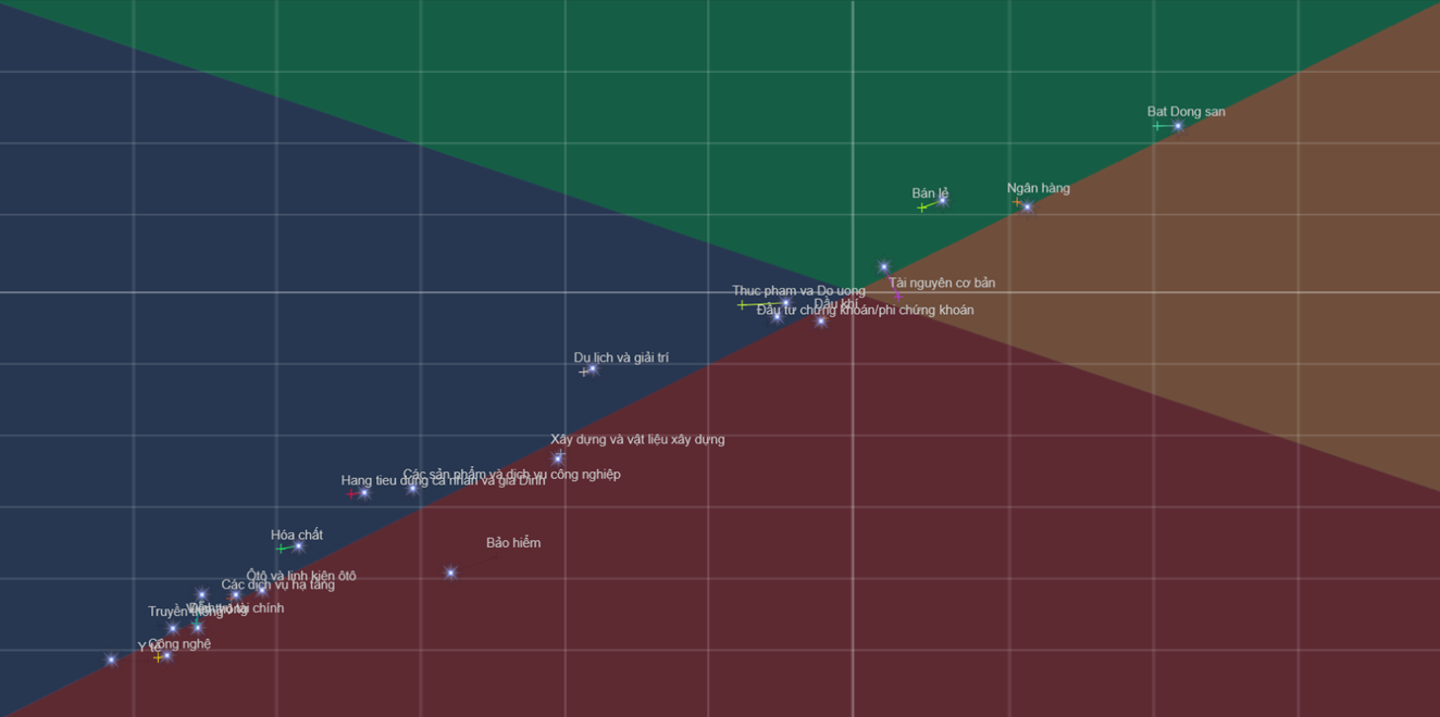Các nhóm ngành trong vùng này có thể sẽ là những nhóm đang chịu các áp lực điều chỉnh và cần tìm vùng hỗ trợ mới trước khi có thể hồi phục và tăng giá trở lại. Do đó đây cũng là khu vực tiềm năng cho các nhân tố đầu tư ứng cử cho nhịp sóng mới tiếp theo.