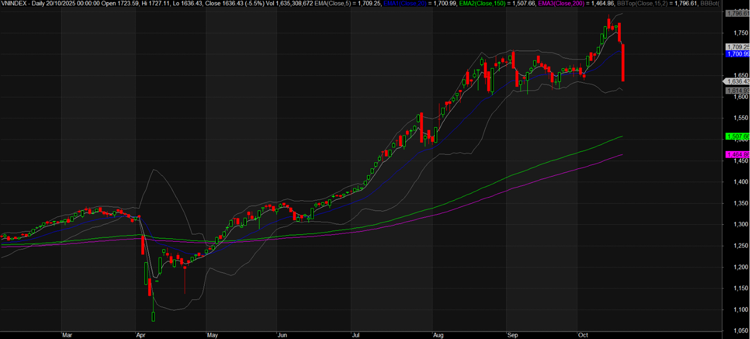 Phiên giao dịch ngày 20/10/2025 đã kết thúc trong một trạng thái bán tháo diện rộng chưa từng có tiền lệ trong lịch sử gần đây, với việc chỉ số VN-Index sụt giảm kỷ lục gần 95 điểm, tương đương mức giảm trên 5,4%, và đóng cửa tại mốc 1.636,43 điểm. Đây là một phiên giao dịch gây "choáng váng" và hoảng loạn tột độ cho nhà đầu tư, khiến vốn hóa thị trường "bốc hơi" hàng trăm nghìn tỷ đồng.