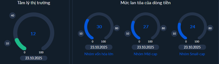 - Dòng tiền rút mạnh khỏi thị trường thể hiện rõ qua mức độ hiện diện thấp trên các nhóm cổ phiếu từ vốn hóa lớn tới nhỏ. Rõ ràng đây là một nhịp rũ mạnh đáng chú ý để vẽ lại nền giá mới cho thị trường tuy nhiên chưa đạt tới mức hấp dẫn và cạn kiệt (<10%) để chạm tới mức cạn cung ngắn hạn tạo tiền đề tốt nhất cho kịch bản tạo đáy. Cần quan sát thêm để có hành động mới đặc biệt là với các vị thế canh mua mới.