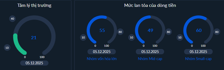 - Chỉ báo lực cầu đang vận động cải thiện và vượt trở lại trên mức 30%. Lần gần nhất chỉ báo này vượt mức 30% là vào giữa kể từ Tháng 8/2025 cho thấy lực mua chủ động đang chuyển biến tích cực. Phân kỳ dương giữa cầu và cung vẫn đang được đảm bảo cho thấy bên mua đang nắm thế áp đặt xu thế ngắn hạn. Trong bối cảnh nhóm vốn hóa lớn tiếp tục luân phiên nâng đỡ chỉ số thì dòng tiền sẽ vẫn có khả năng tiếp tục trở lại thị trường từ đó lan tỏa, giúp các cổ phiếu tạo đáy và bước vào nhịp hồi phục ngắn hạn.