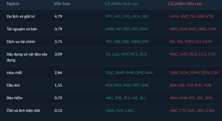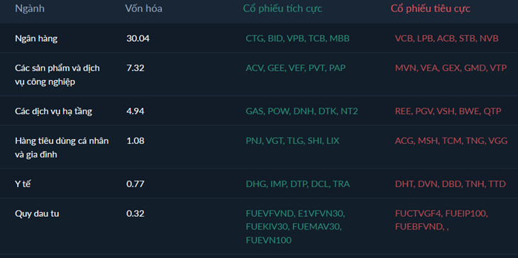 Động lực chính duy trì đà tăng của thị trường đến từ sự dẫn dắt mạnh mẽ của nhóm cổ phiếu vốn hóa lớn, đặc biệt là nhóm Vingroup (VIC, VPL, VHM). Cổ phiếu VIC đã có phiên tăng kịch trần vào ngày cuối tuần, nhờ thông tin chia cổ tức bằng cổ phiếu tỉ lệ 1:1, đóng vai trò trụ cột níu giữ sắc xanh và hỗ trợ mạnh mẽ cho chỉ số chung. Dòng tiền cũng có sự luân chuyển tích cực sang các nhóm ngành khác đặc biệt là Ngân hàng (với các mã như MBB, BID, CTG) và các đại diện Midcap như Bán lẻ (FRT, MWG) và Thép (HPG, NKG) sau giai đoạn tích lũy.