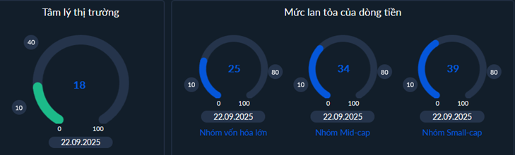 - Dòng tiền tại nhóm vốn hóa lớn đã không còn tích cực khi trượt xuống dưới mức an toàn (>50%) lần đầu trong chuỗi tăng từ đầu Tháng 5/2025 đến nay là một sự thay đổi lớn. Tín hiệu phục hồi của nhóm này gần đây chưa rõ nét cũng khiến chỉ số thị trường vận động không rõ xu thế. Nhóm này có tỷ trọng vốn hóa lớn trong rổ chỉ số vì vậy khi chuyển biến tiêu cực cũng sẽ ảnh hưởng mạnh tới thị trường. Kịch bản xấu nhất đó là xảy ra sự rũ bỏ mạnh xuống mức cạn kiệt của dòng tiền (>10%) trên toàn bộ các nhóm vốn hóa từ đó tạo ra một thế trận mới với nền giá mới.