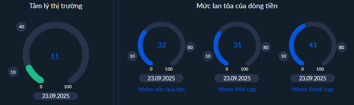 - Dòng tiền tại nhóm vốn hóa lớn đã không còn tích cực khi trượt xuống dưới mức an toàn (>50%) lần đầu trong chuỗi tăng từ đầu Tháng 5/2025 đến nay là một sự thay đổi lớn. Tín hiệu phục hồi của nhóm này gần đây chưa rõ nét cũng khiến chỉ số thị trường vận động không rõ xu thế. Nhóm này có tỷ trọng vốn hóa lớn trong rổ chỉ số vì vậy khi chuyển biến tiêu cực cũng sẽ ảnh hưởng mạnh tới thị trường. Kịch bản xấu nhất đó là xảy ra sự rũ bỏ mạnh xuống mức cạn kiệt của dòng tiền (>10%) trên toàn bộ các nhóm vốn hóa từ đó tạo ra một thế trận mới với nền giá mới.