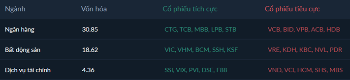 Nhóm cổ phiếu trụ gồm BĐS và Ngân hàng đều đang dịch chuyển tiêu cực vào vùng Suy yếu dẫn tới thị trường thiếu vắng dòng cổ phiếu dẫn dắt, chỉ số khó tránh khỏi bị ảnh hưởng tiêu cực.