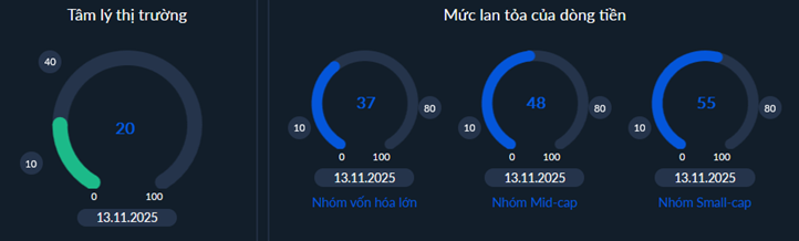 - Dòng tiền rút mạnh khỏi thị trường thể hiện rõ qua mức độ hiện diện thấp trên các nhóm cổ phiếu từ vốn hóa lớn tới nhỏ (<50%). Rõ ràng đây là một nhịp rũ mạnh đáng chú ý để vẽ lại nền giá mới cho thị trường tuy nhiên chưa đạt tới mức hấp dẫn và cạn kiệt (<10%) để chạm tới mức cạn cung ngắn hạn tạo tiền đề tốt nhất cho kịch bản tạo đáy. Cần quan sát thêm để có hành động mới đặc biệt là với các vị thế canh mua mới.