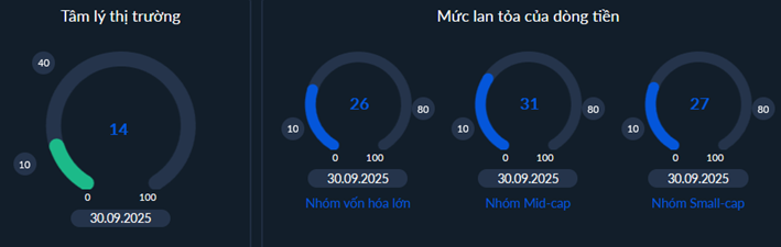 - Dòng tiền dù có cải thiện nhưng ở mức rất chậm và đang ở dưới mức trung bình (50%) trên hầu hết các nhóm cổ phiếu. Nhóm vốn hóa lớn thậm chí đang là nhóm không được dòng tiền ưa chuộng như giai đoạn trước khiến cho vai trò dẫn dắt chỉ số cũng bị ảnh hưởng. Khi nhóm vốn hóa lớn tiếp tục suy giảm dòng tiền thì chỉ số sẽ khó hồi một cách bền vững trong khi rung lắc và điều chỉnh là càng dễ xảy ra hơn.